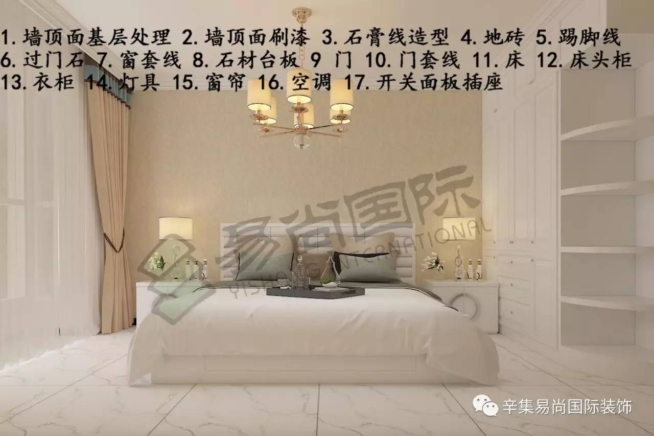 次卧室:墙顶面下层处置+墙顶面刷漆+石膏线制型+地砖+踢 脚线+过门石+窗套线+石材台板+床+床头柜+衣柜+门+门套线+灯具+美的空调+窗帘。