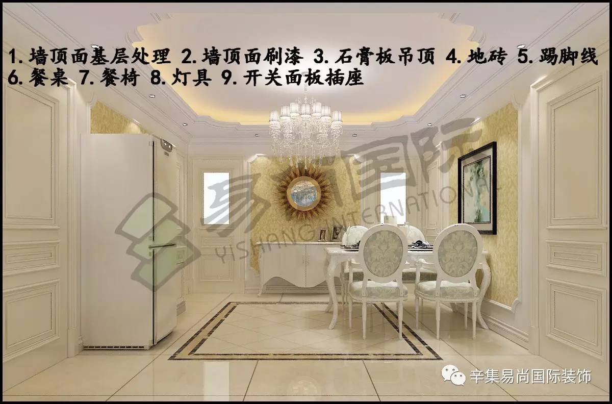 走廊门厅:墙顶下层处置+墙顶面刷漆+石膏板吊顶+石膏线制型+地砖+踢脚线+过门石+门套线。餐厅:墙顶面下层处置+墙顶面刷漆+石膏板吊顶+地砖+踢脚线+餐桌+餐椅+灯具。从卧室:墙顶下层处置+墙顶刷漆+石膏线制型+地砖+踢脚线 +过门石+窗套线+石材台板+门+门套+床+床头柜+衣柜+灯具+窗帘+美的空调。客堂:墙顶面下层处置+墙顶面刷漆+石膏板吊顶+电视墙制型 +地砖+踢脚线+垭口+沙发+茶几+电视柜+窗帘+海信4Kled电视+美的智能立式空调+灯具+垭口。