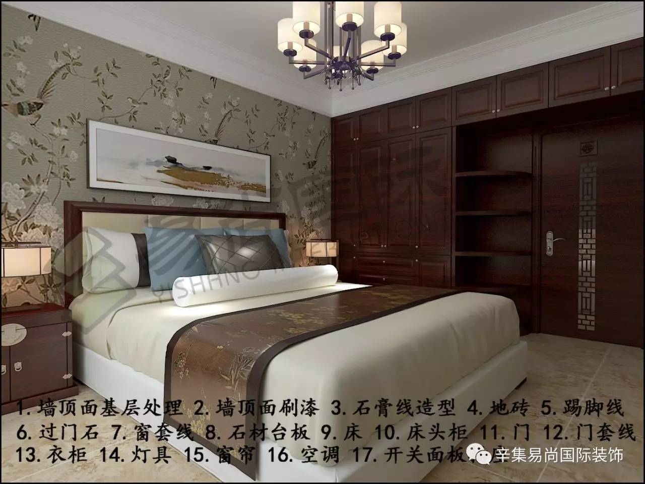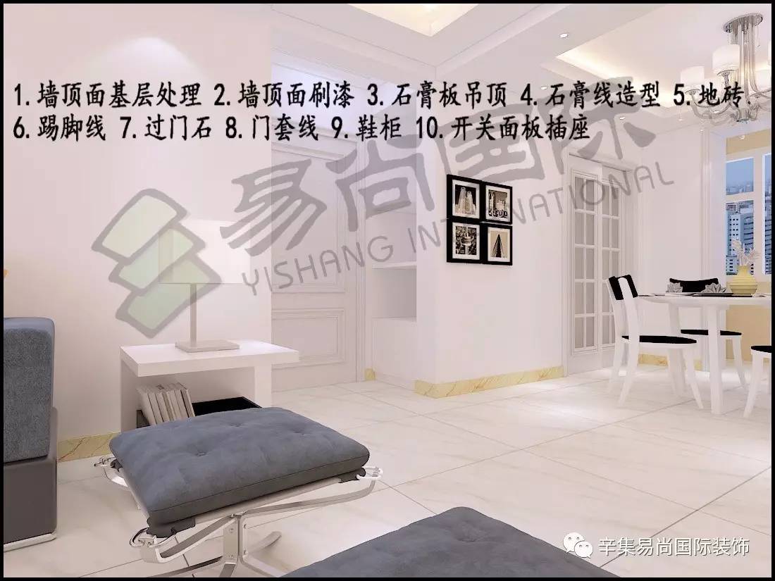走廊门厅:墙顶下层处置+墙顶面刷漆+石膏板吊顶+石膏线制型+地砖+踢脚线+过门石+门套线。餐厅:墙顶面下层处置+墙顶面刷漆+石膏板吊顶+地砖+踢脚线+餐桌+餐椅+灯具。从卧室:墙顶下层处置+墙顶刷漆+石膏线制型+地砖+踢脚线 +过门石+窗套线+石材台板+门+门套+床+床头柜+衣柜+灯具+窗帘+美的空调。客堂:墙顶面下层处置+墙顶面刷漆+石膏板吊顶+电视墙制型 +地砖+踢脚线+垭口+沙发+茶几+电视柜+窗帘+海信4Kled电视+美的智能立式空调+灯具+垭口。
